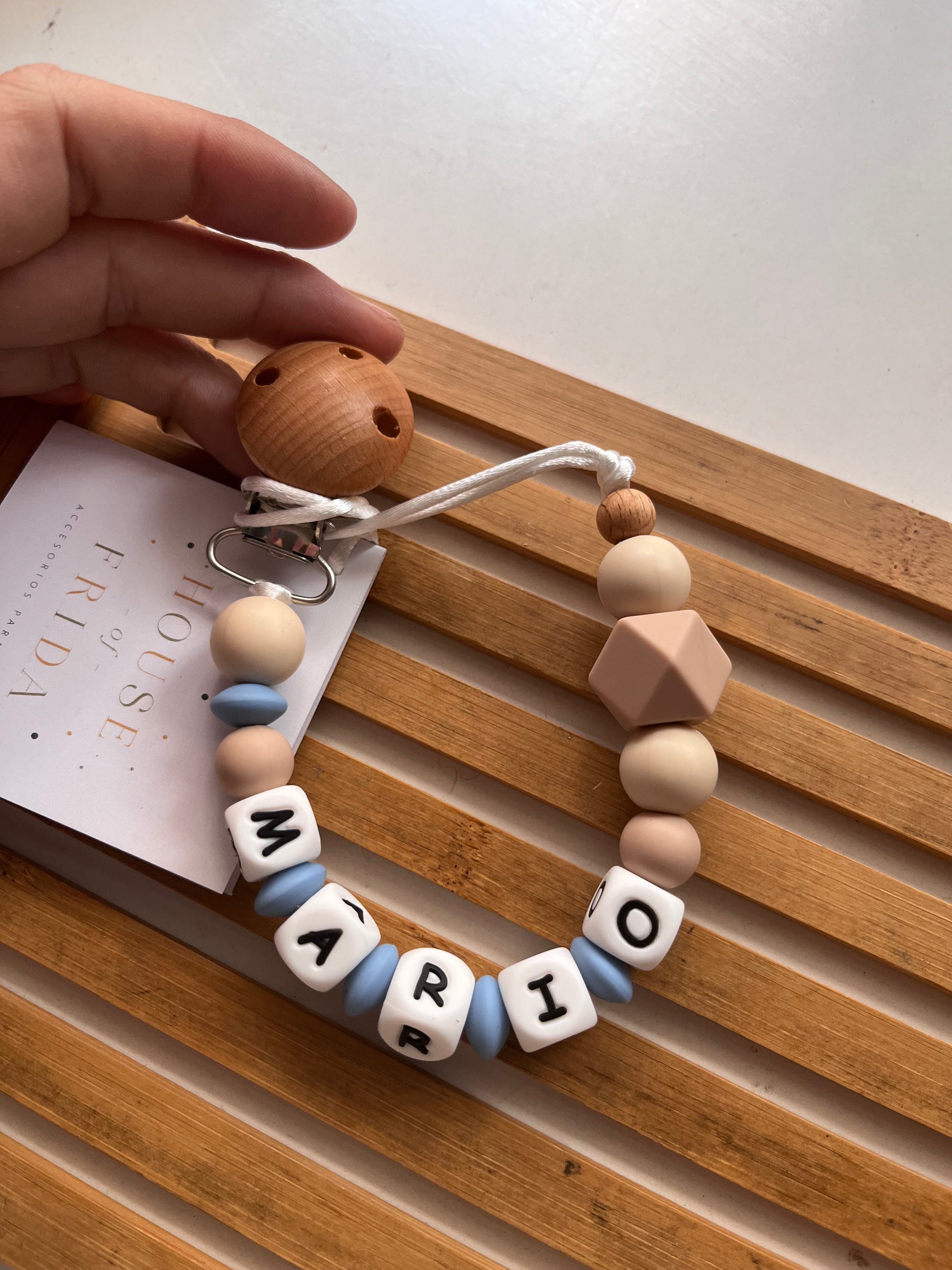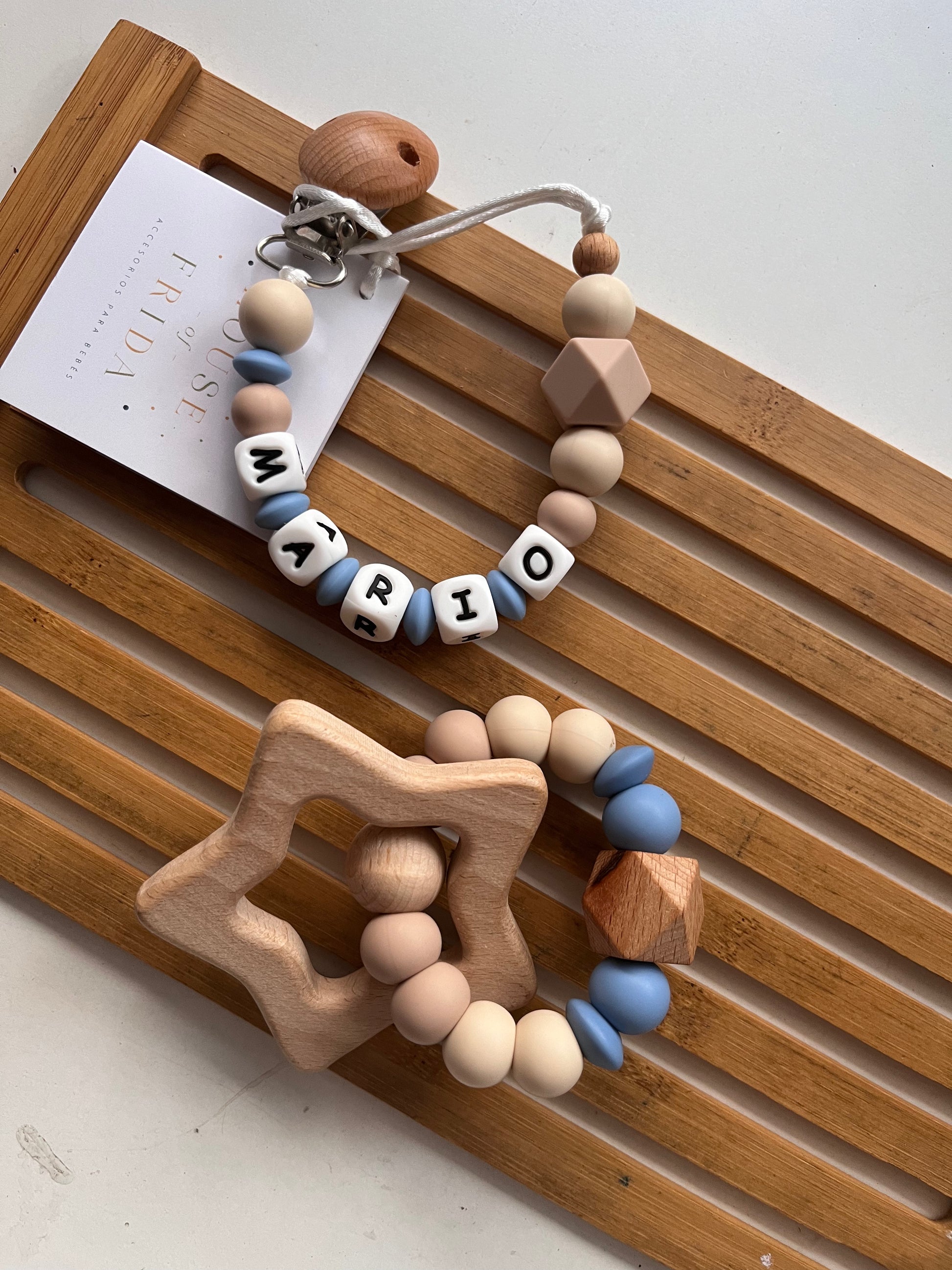 Mordedores y chupeteros 100% silicona certificada orgánica y antibacteriana y madera de haya certificada procedente de bosques sostenibles, mordisqueable y suave para las encías de tu bebé.
