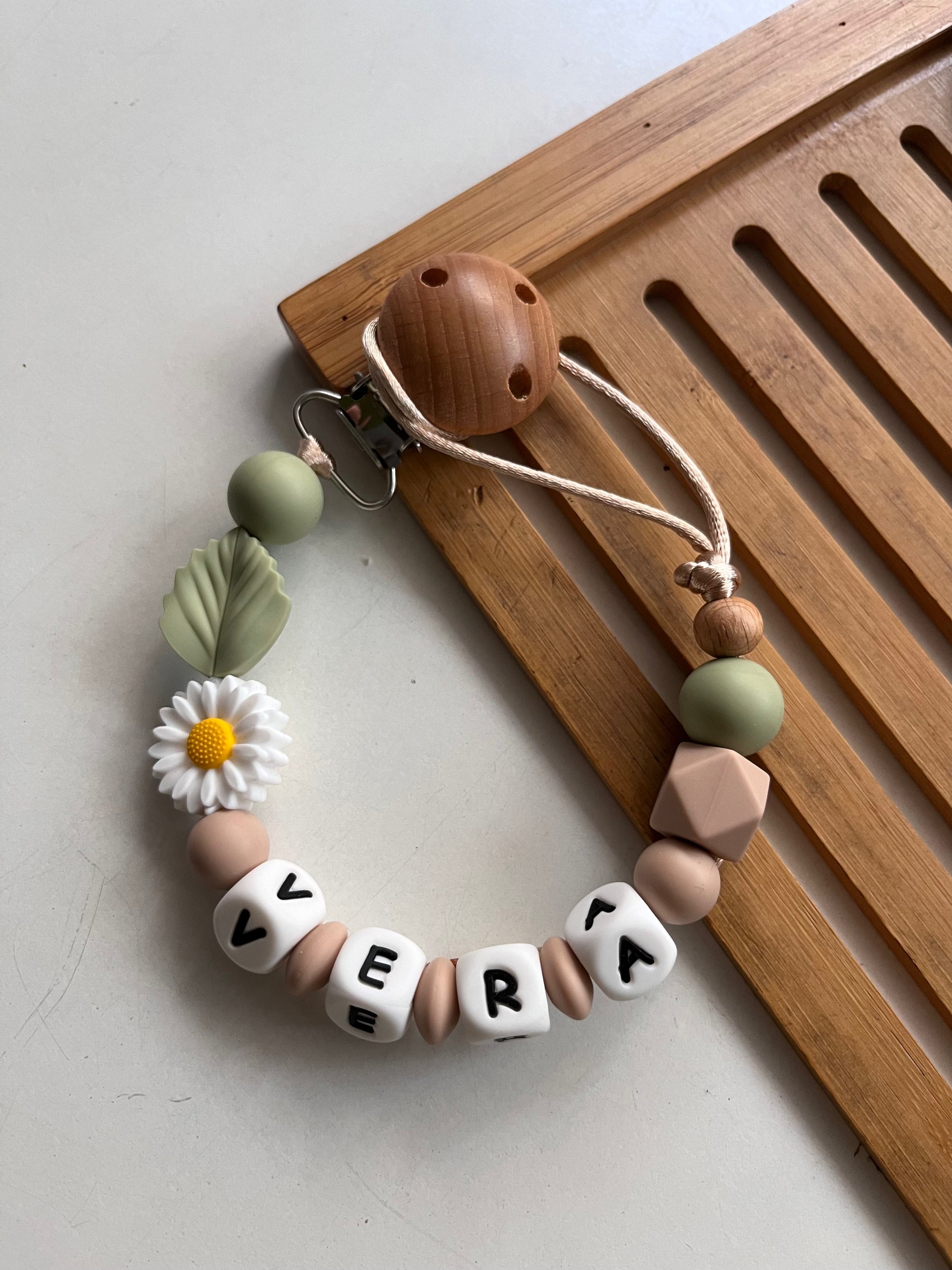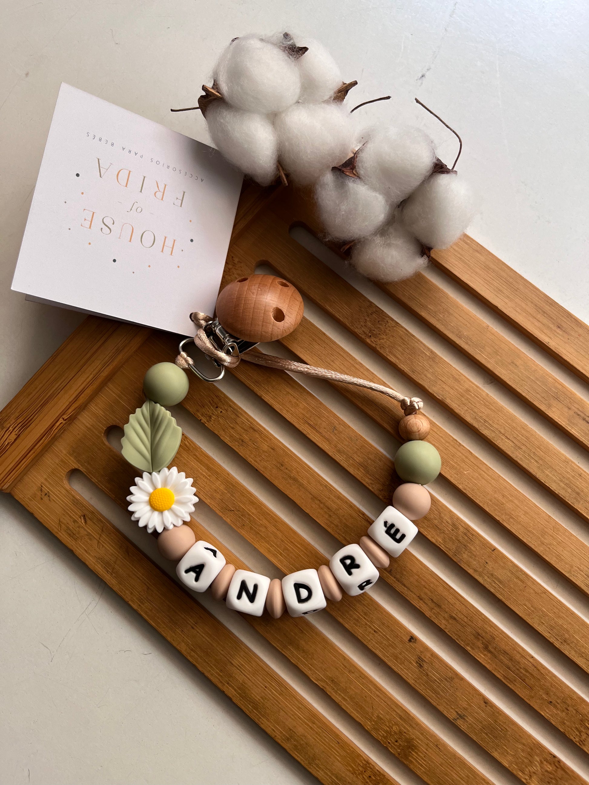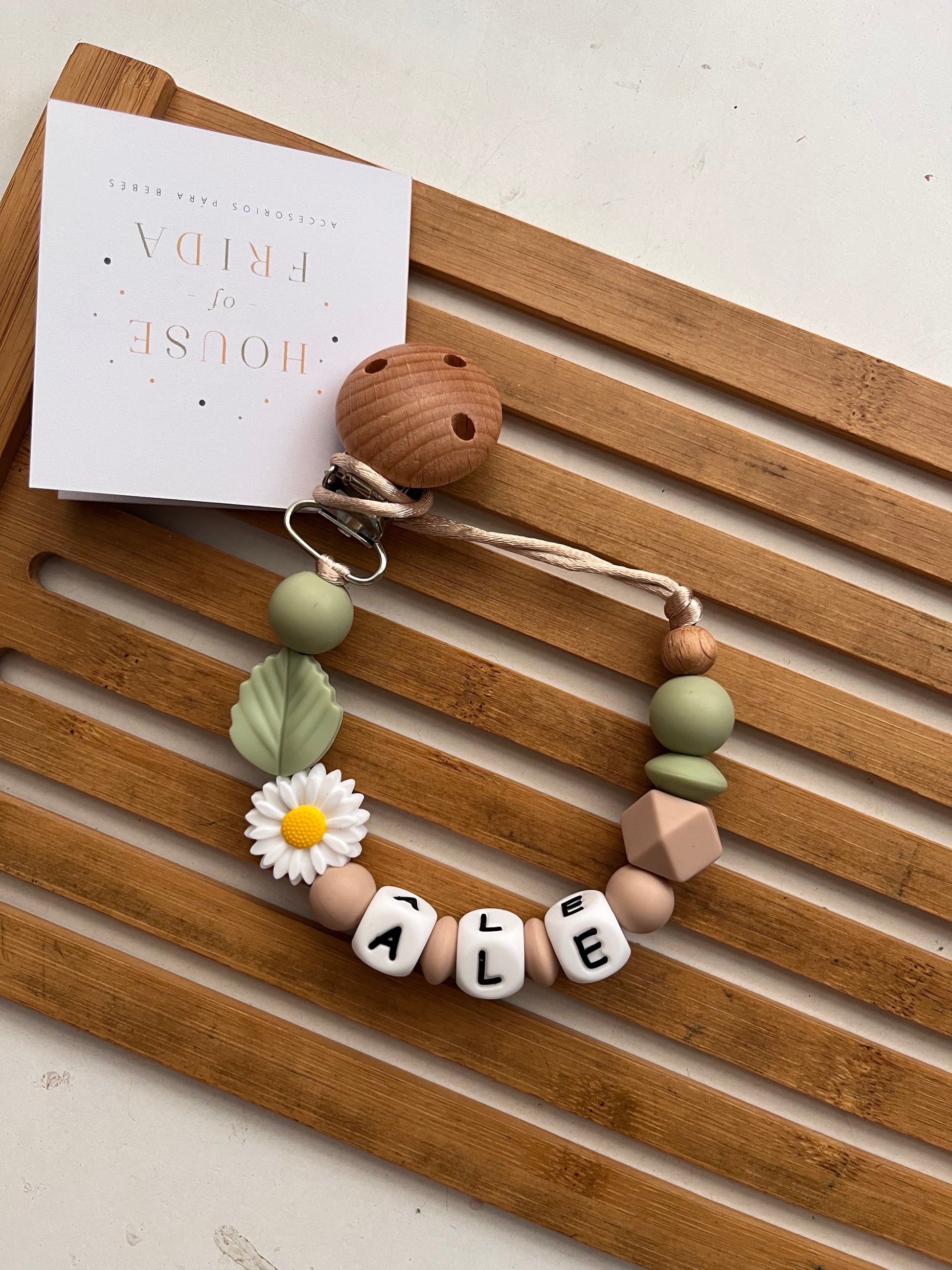 IMPORTANTE: la flor y la hoja se pueden poner ambas con un nombre de hasta 5 letras máximo. La flor o la hoja solas con nombre máximo de 6 letras. Las bolas de los extremos se pueden cambiar de color, rosa, mostaza, celeste etc … indicar en la cajita de comentarios.