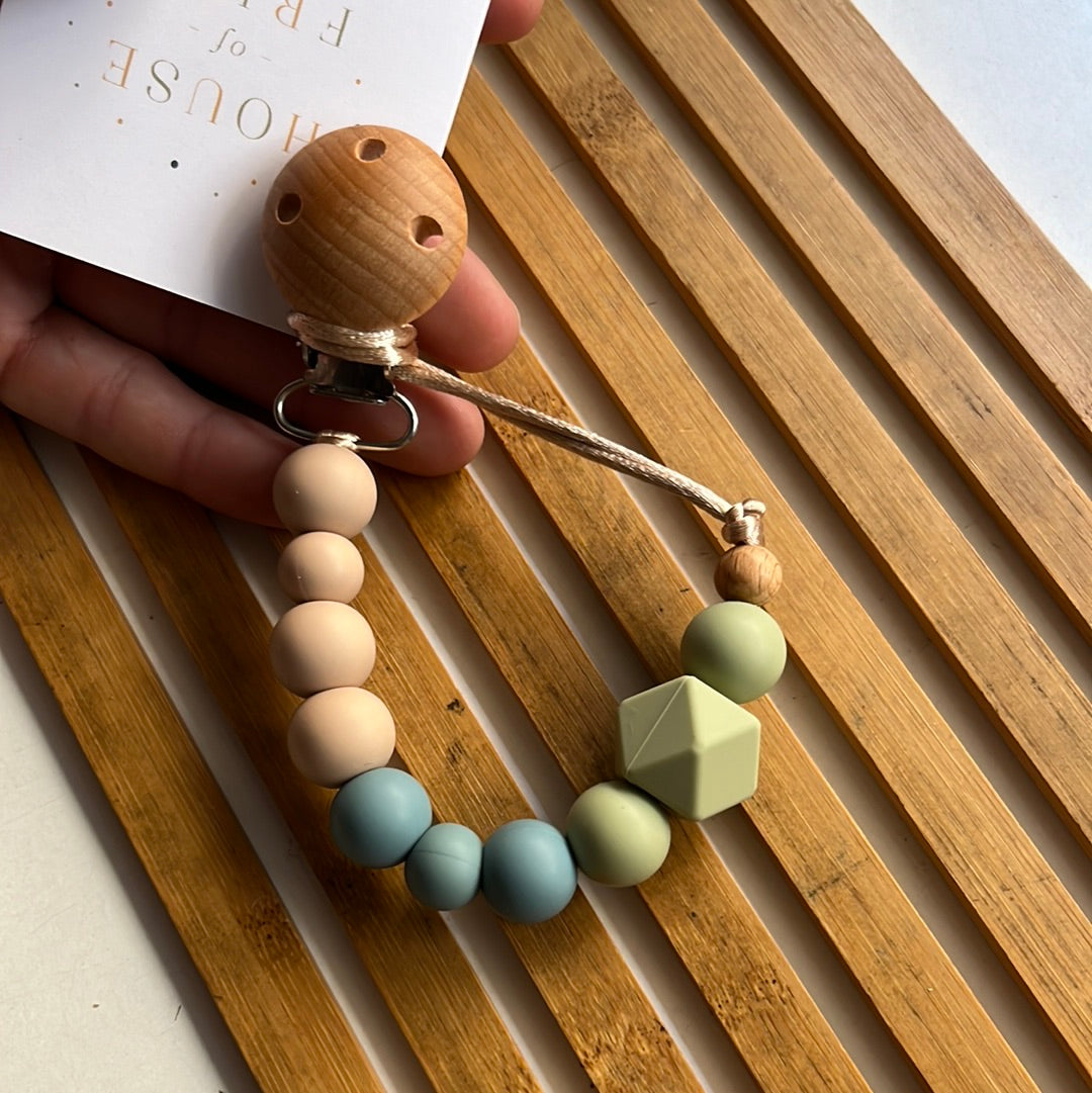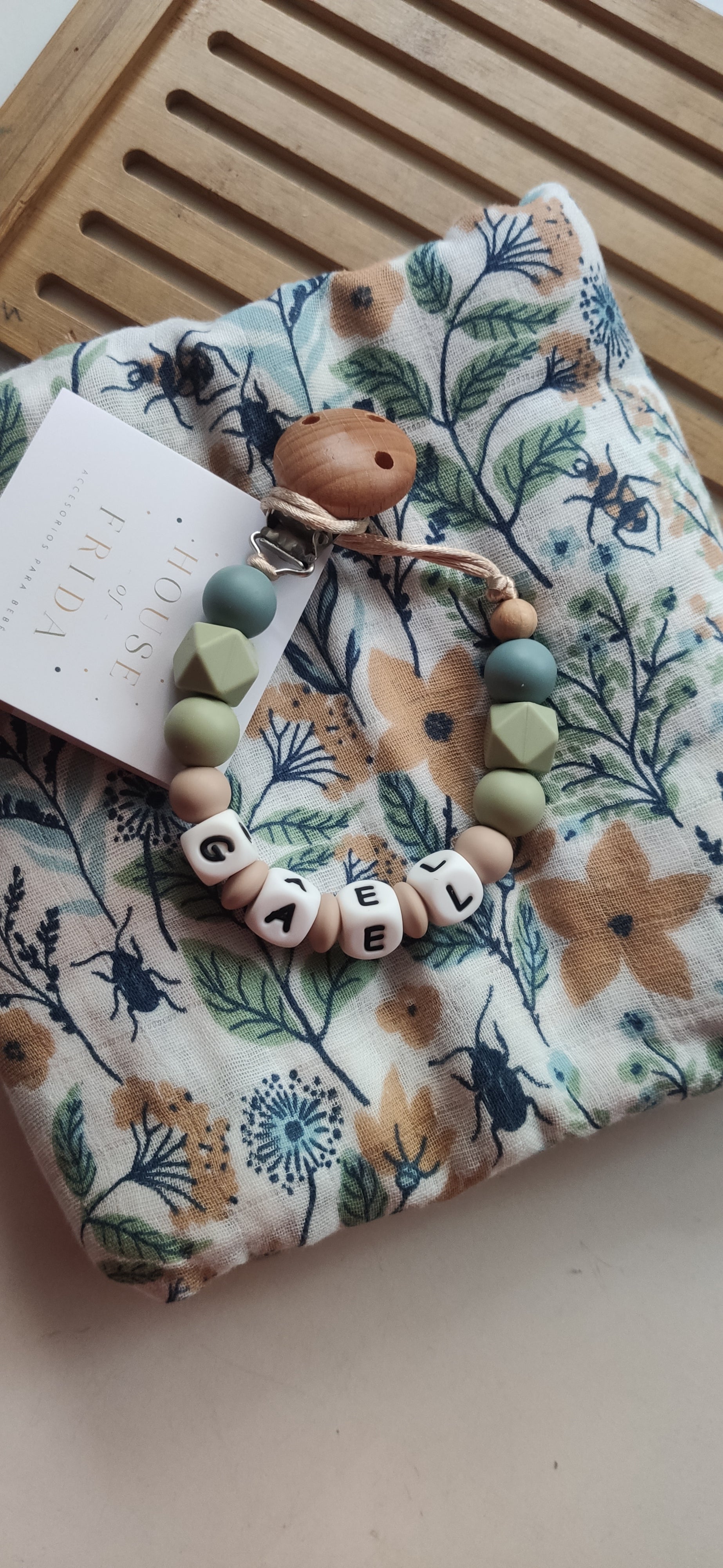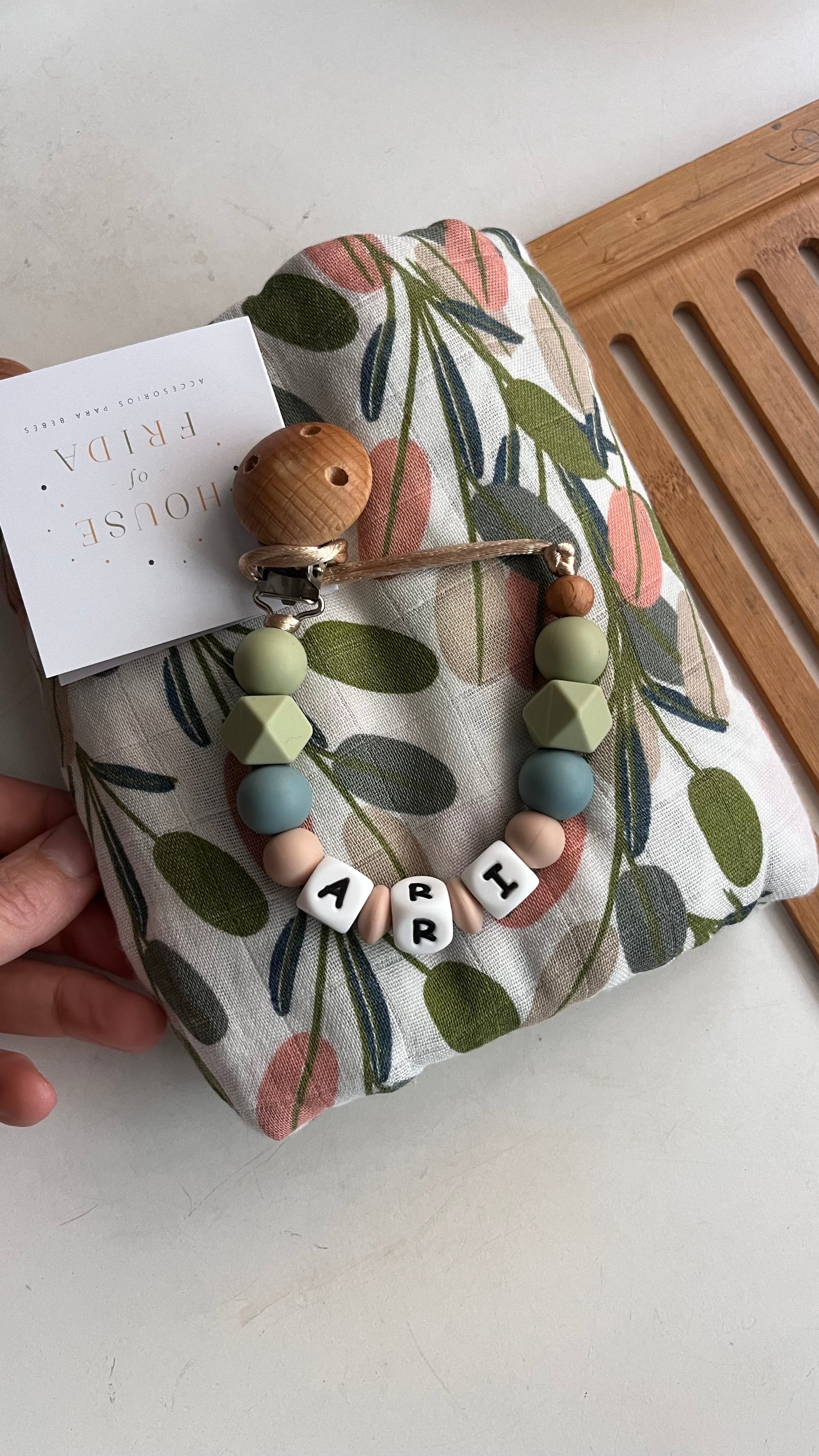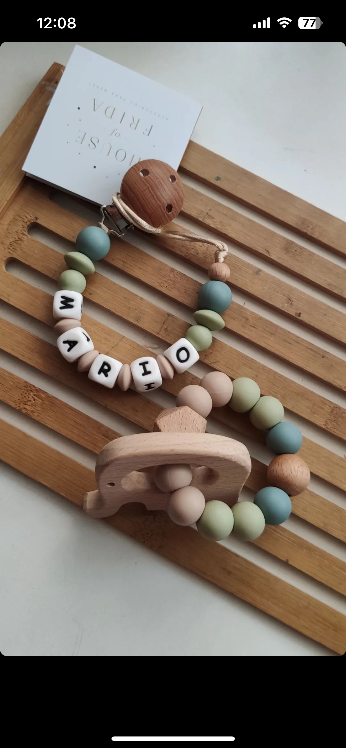 Mordedores y chupeteros 100% silicona certificada orgánica y antibacteriana y madera de haya certificada procedente de bosques sostenibles, mordisqueable y suave para las encías de tu bebé.