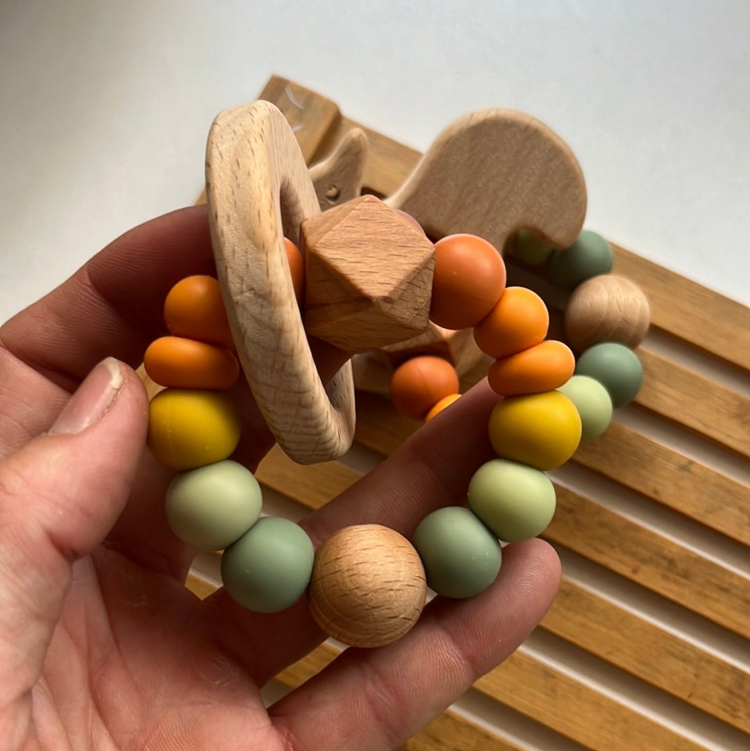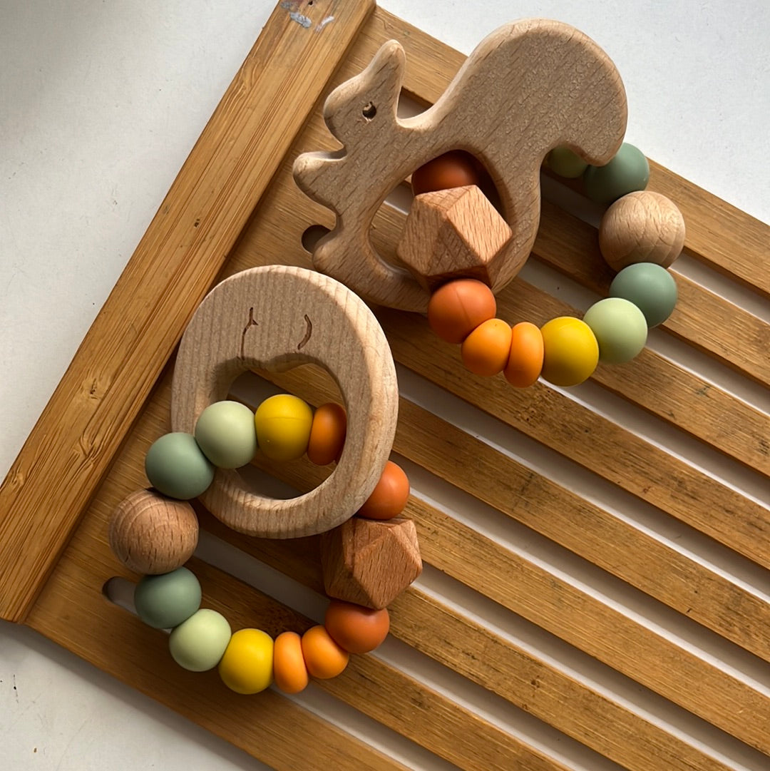 Mordedores y chupeteros 100% silicona certificada orgánica y antibacteriana y madera de haya certificada procedente de bosques sostenibles, mordisqueable y suave para las encías de tu bebé.