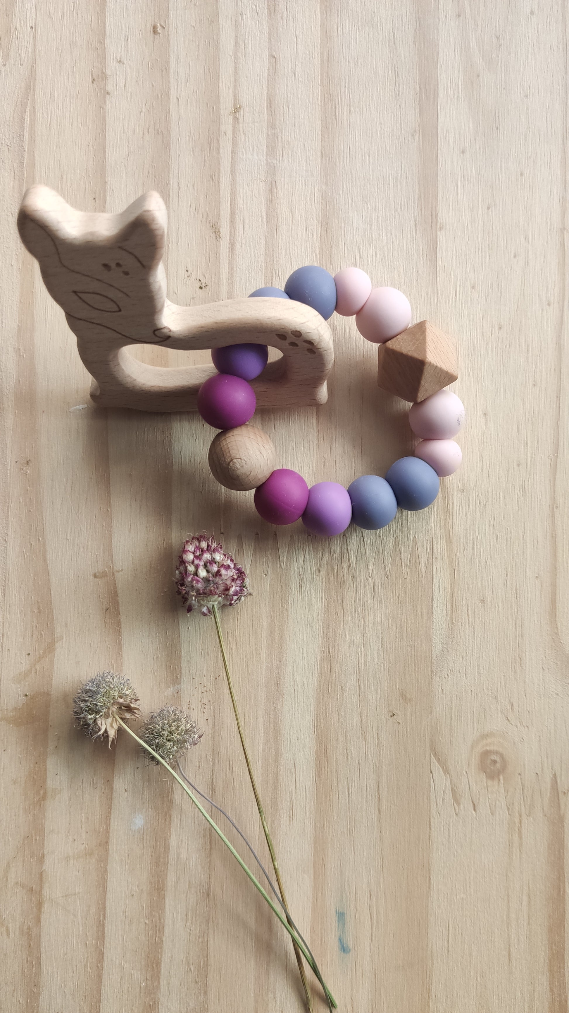 Mordedores y chupeteros 100% silicona certificada orgánica y antibacteriana y madera de haya certificada procedente de bosques sostenibles, mordisqueable y suave para las encías de tu bebé.
