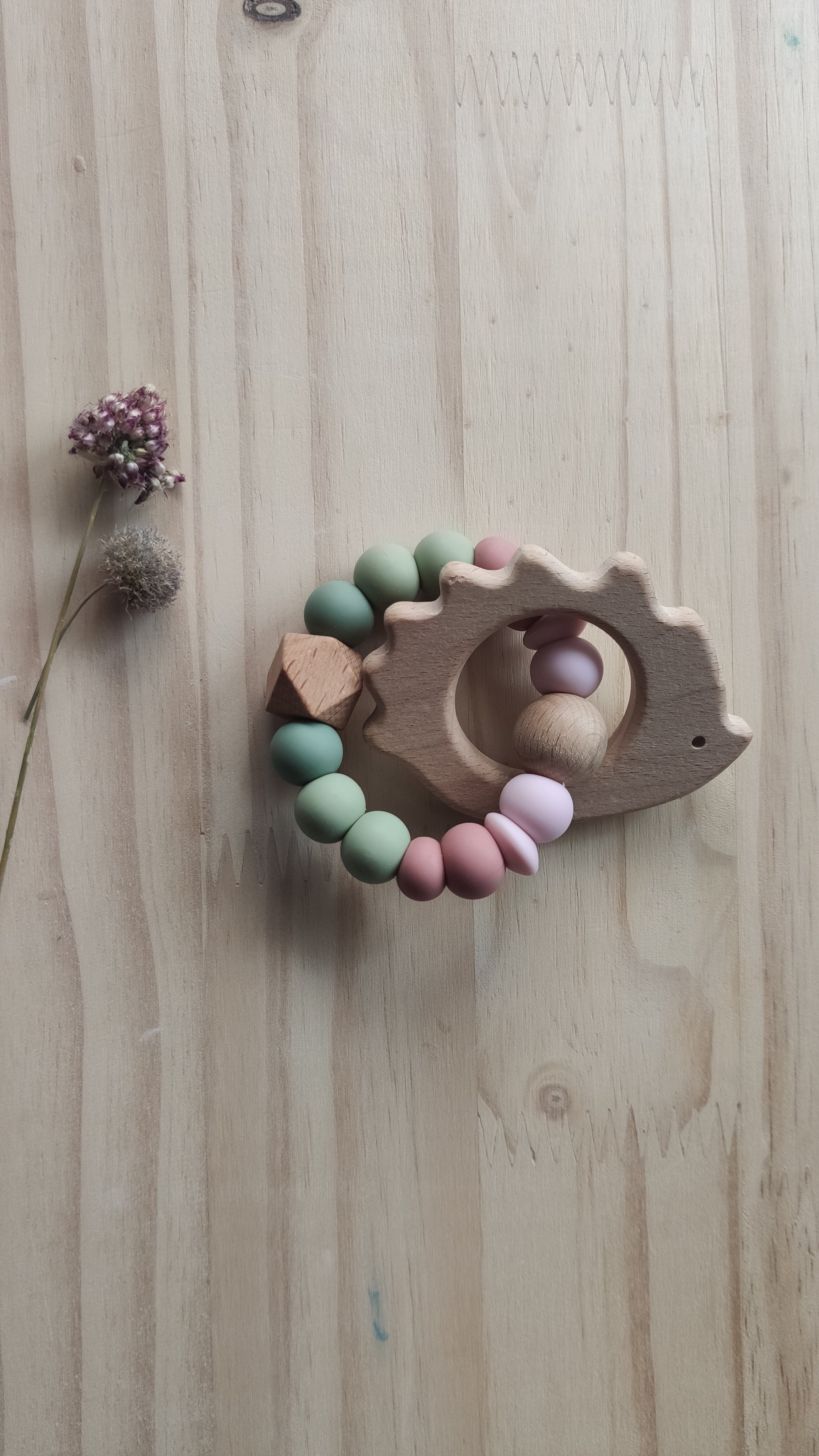 Mordedores y chupeteros 100% silicona certificada orgánica y antibacteriana y madera de haya certificada procedente de bosques sostenibles, mordisqueable y suave para las encías de tu bebé.