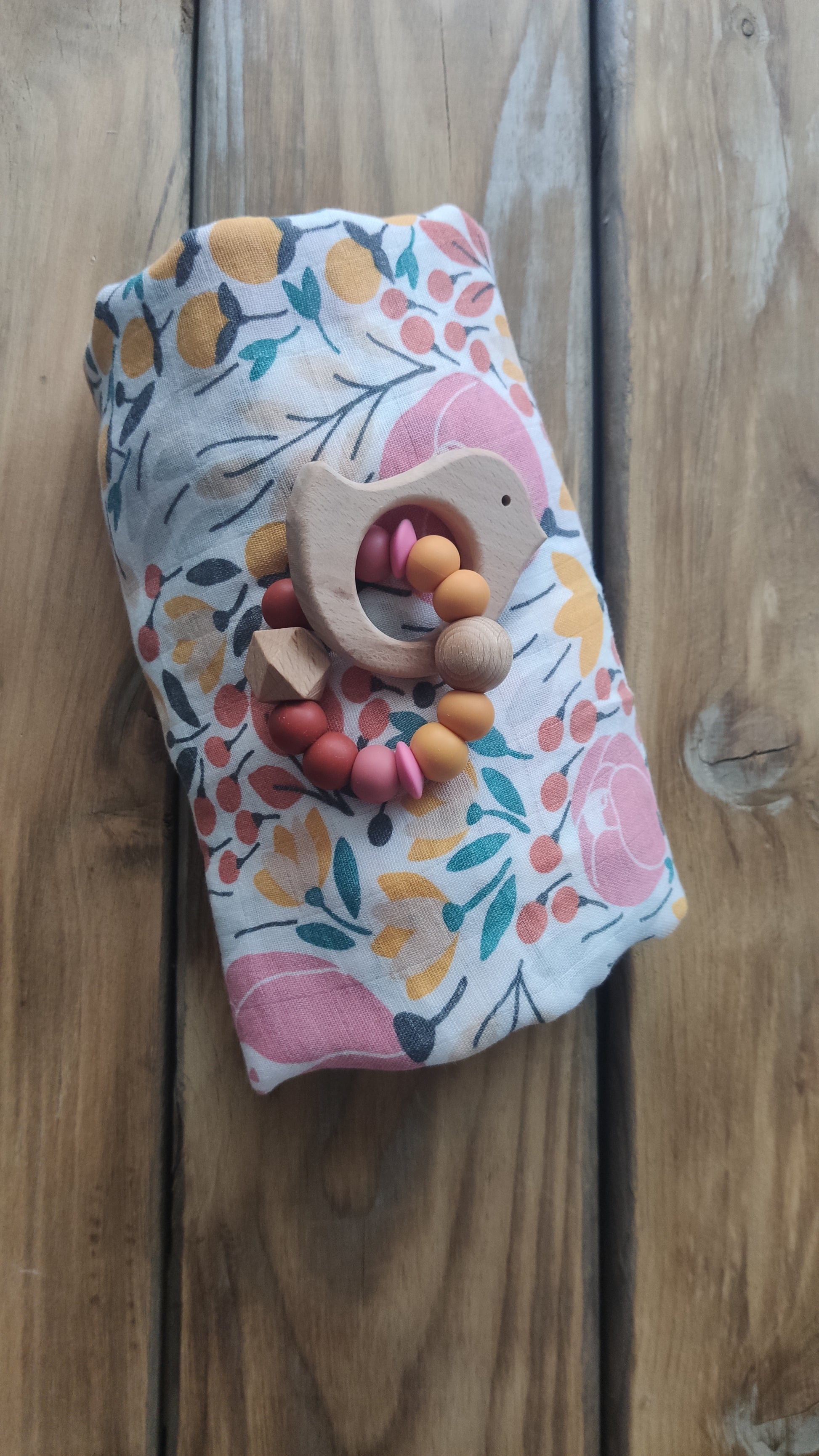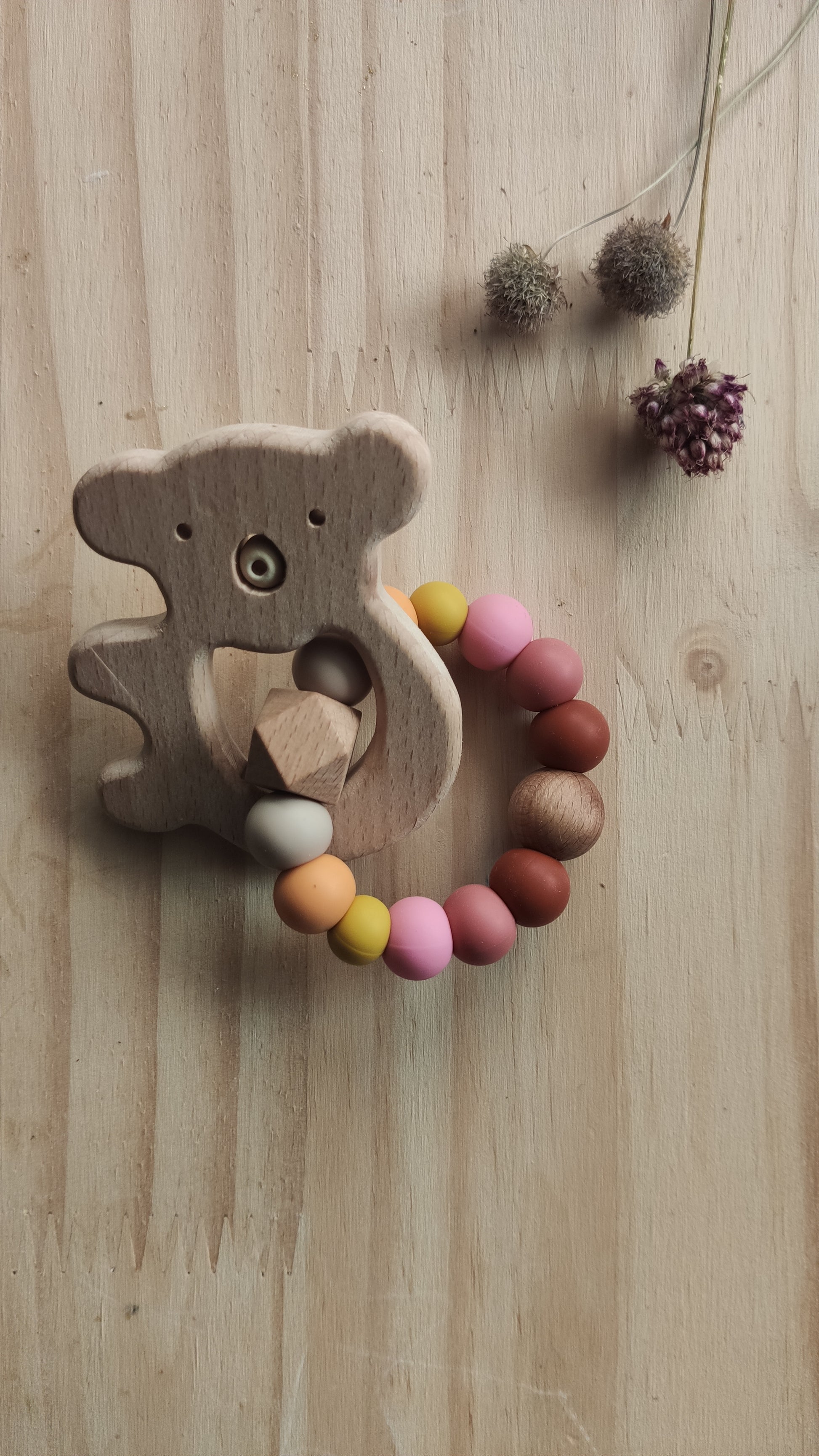 Mordedores y chupeteros 100% silicona certificada orgánica y antibacteriana y madera de haya certificada procedente de bosques sostenibles, mordisqueable y suave para las encías de tu bebé.