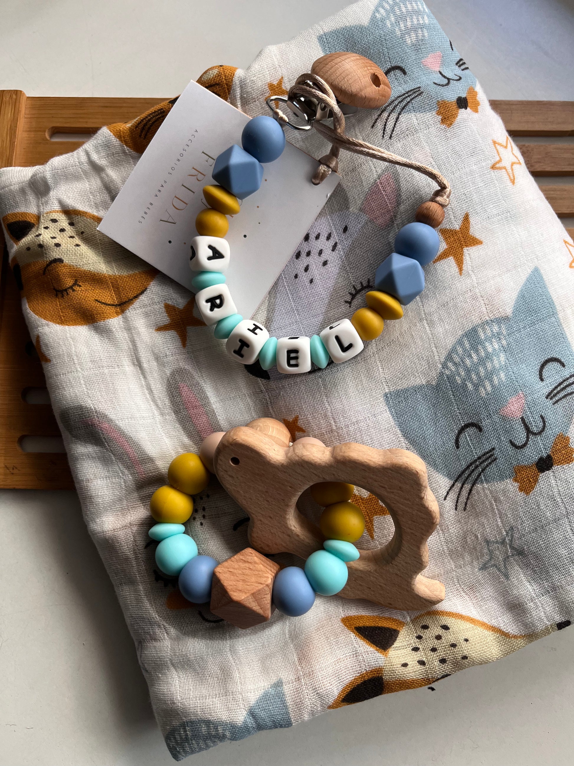 INFORMACION IMPORTANTE: el mordedor de madera puede elegirse entre estas figuras: pájaro, elefante, jirafa, ardilla y estrella.