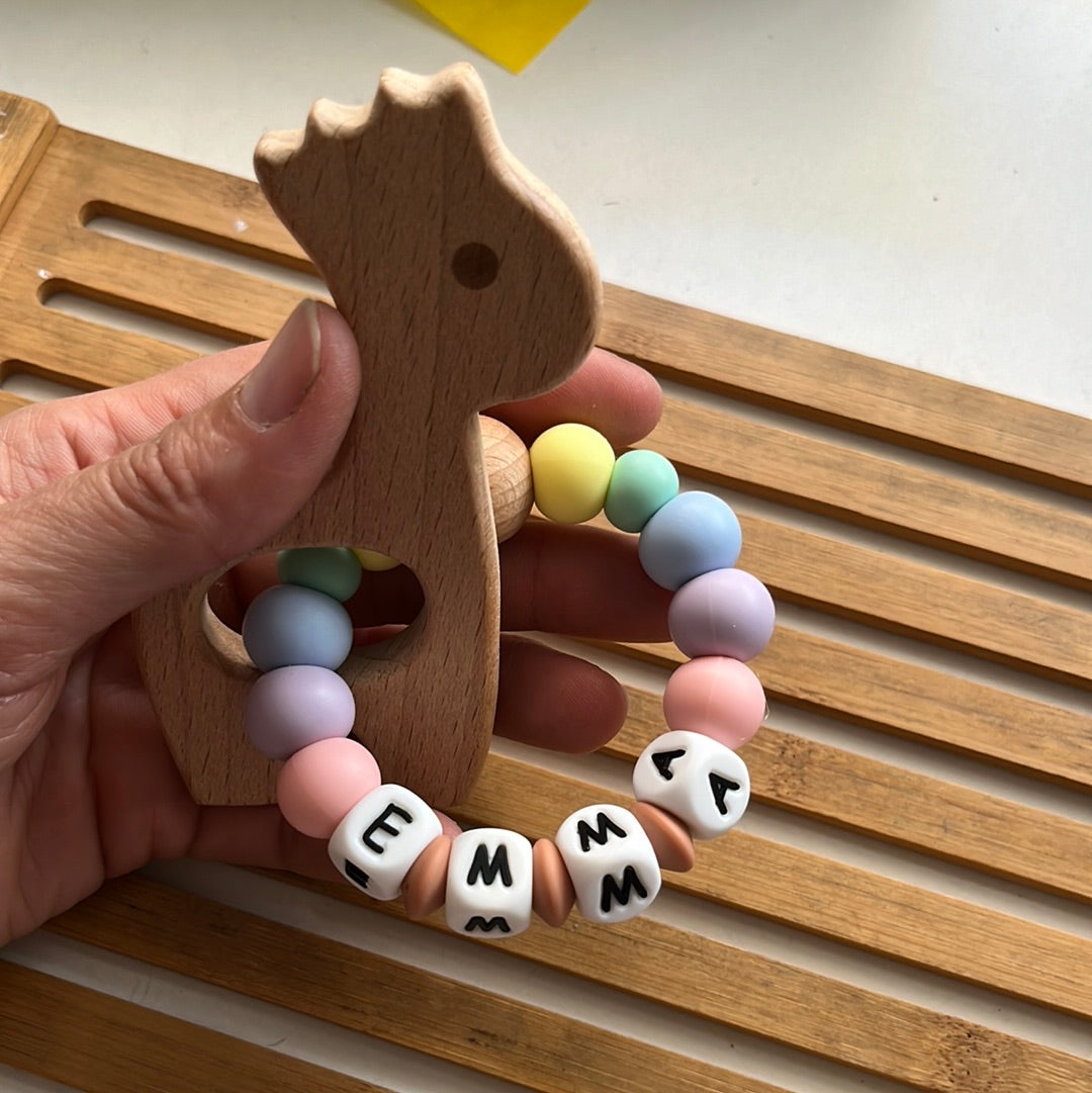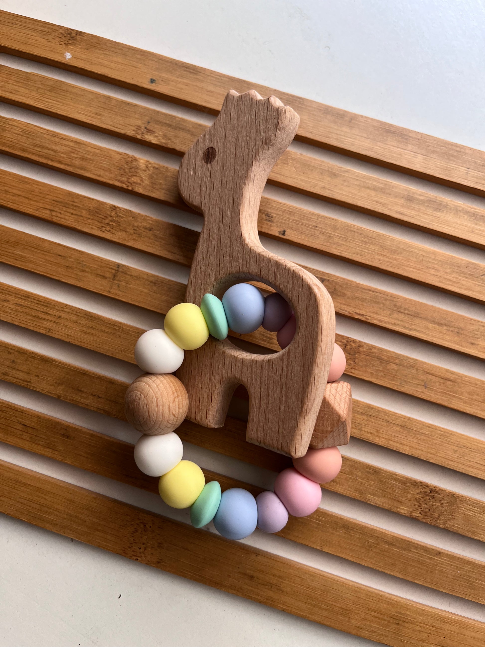 INFORMACION IMPORTANTE: el mordedor de madera puede elegirse entre estas figuras: pájaro, elefante, jirafa, erizo, ardilla y estrella.